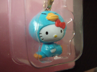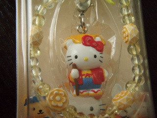 巫女さん姿のキティが鈴をならして、お祓いしています。